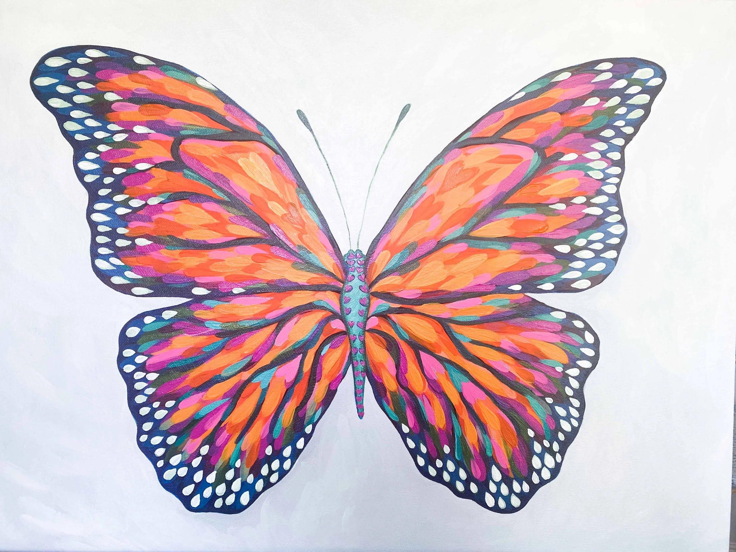 I absolutely love the way the final piece came together. I love all of the hidden hears inside the wings. I love the color combinations to create depth and how the white spots pop. I love the atmospheric background with its subtle range of white color and brush stroke texture. The markings on the butterfly were a final detail that felt important, hearts to signify how loved she is.